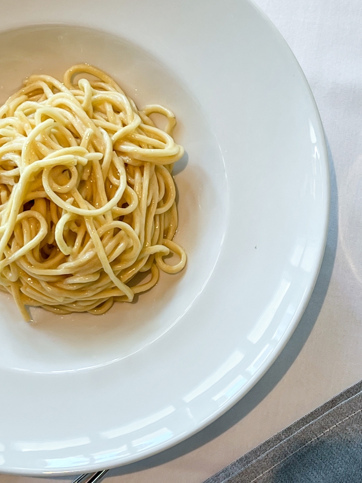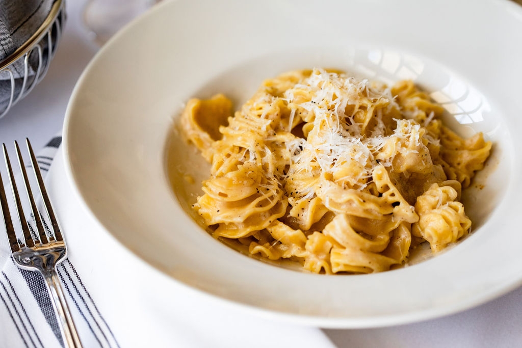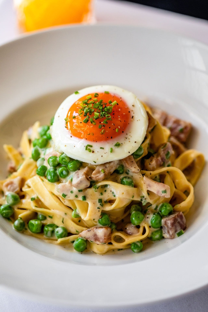 Pancetta, green peas, carbonara sauce, egg sunny side up