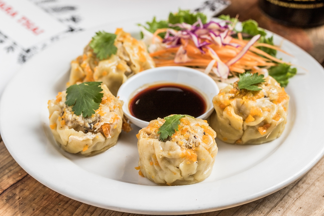 Seasoned chicken, shrimp, mushrooms, and water chestnuts ground up in a dumpling wrapper, served with soy vinegar sauce