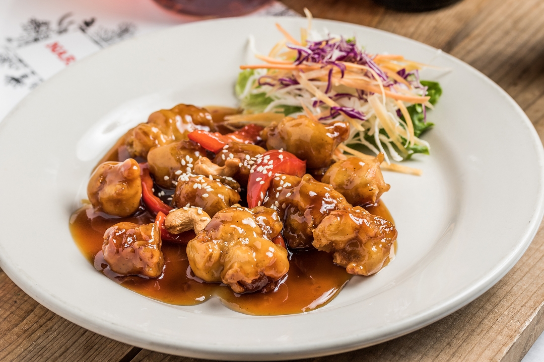 Deep fried breaded chicken or a protein of your choice, bell pepper, cashew nut, and sesame seed in orange sauce