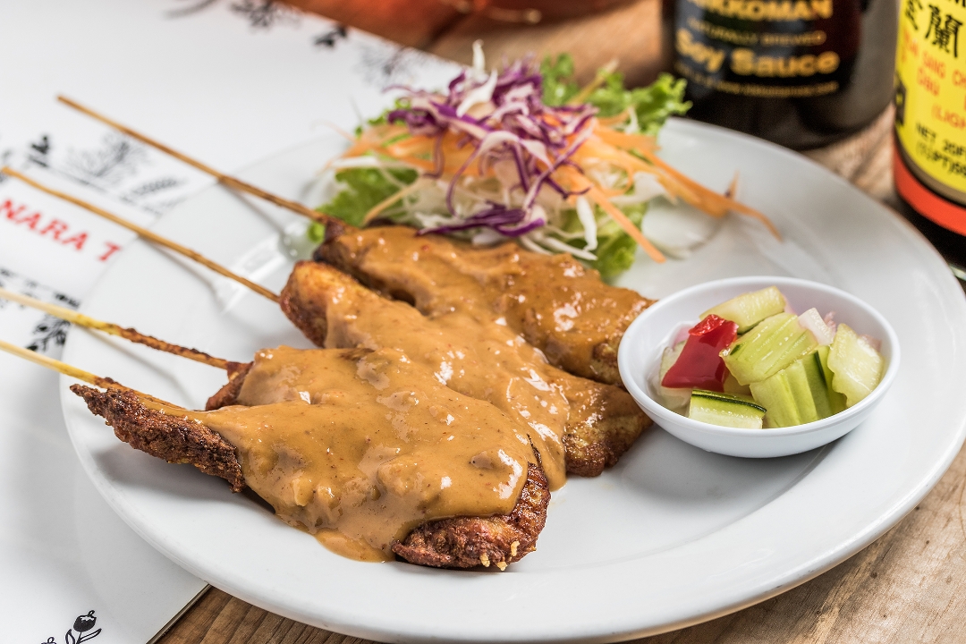 Sticks of chicken breast, grilled and served with peanut sauce dip & cucumber relish