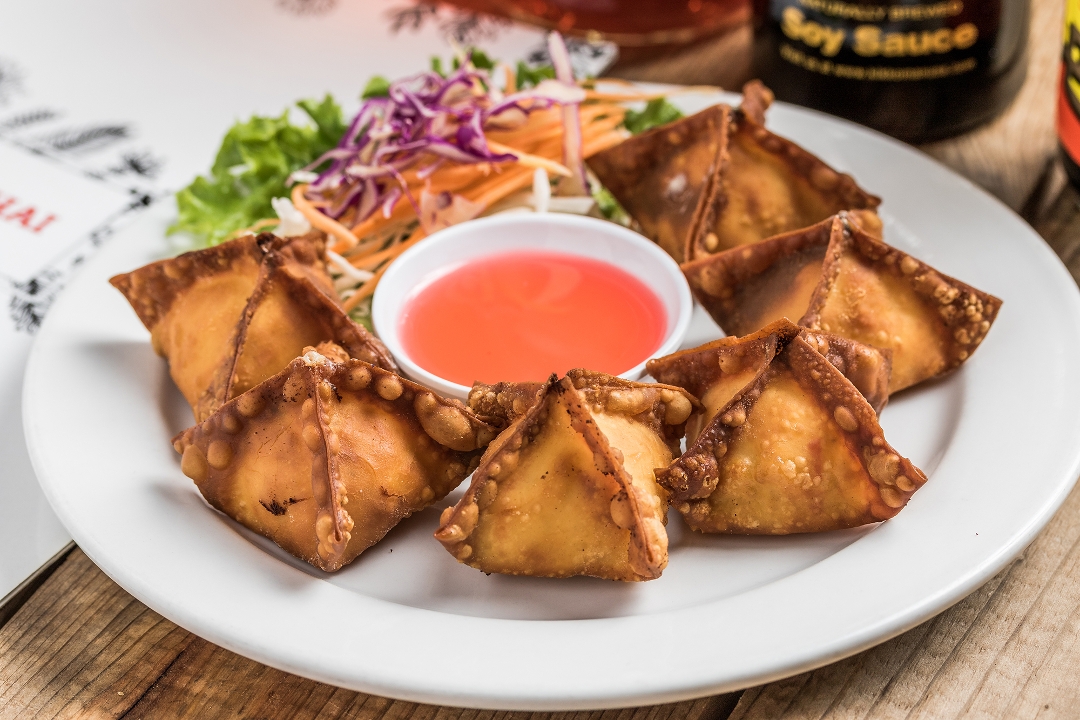 Fried wontons stuffed with cream cheese, scallion, and crab with spring roll sauce