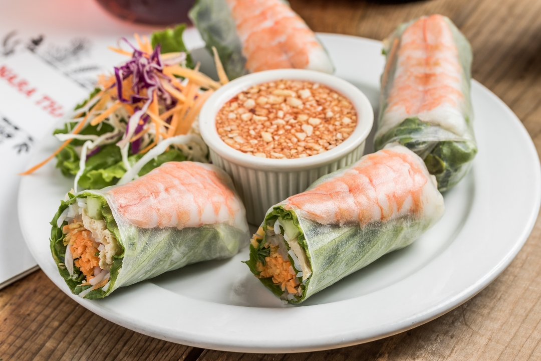Rolls with chicken, shrimp, lettuce, bean sprouts, vermicelli noodles, cilantro, carrots, and cucumbers wrapped in clear rice paper with spicy peanut sauce or a spring roll sauce