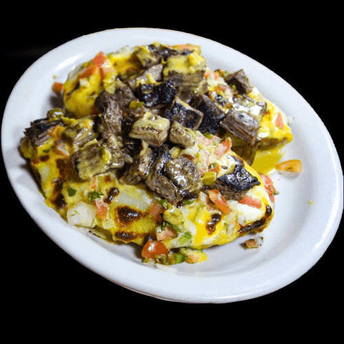 Whole potato filled in with sour cream, melted cheese, grilled fajitas chunks, pico de gallo, and queso Dip on top.