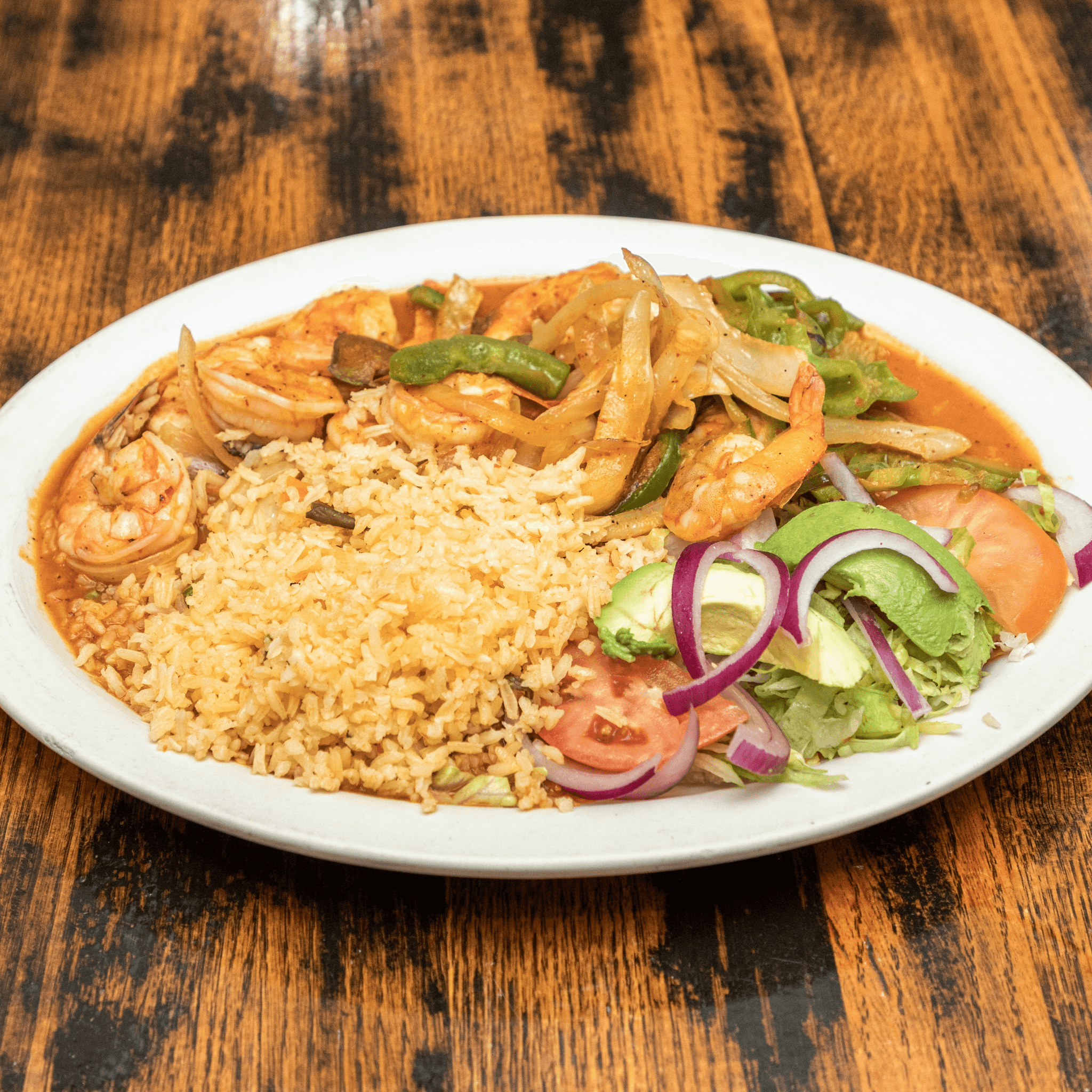 Delicious spicy diabla shrimp, served with rice salad and salad
