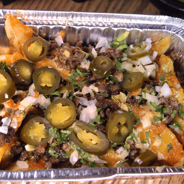 French fries, served with onions cilantro, fajita topped with chile con queso dip, pickled jalapeños and bacon bites
