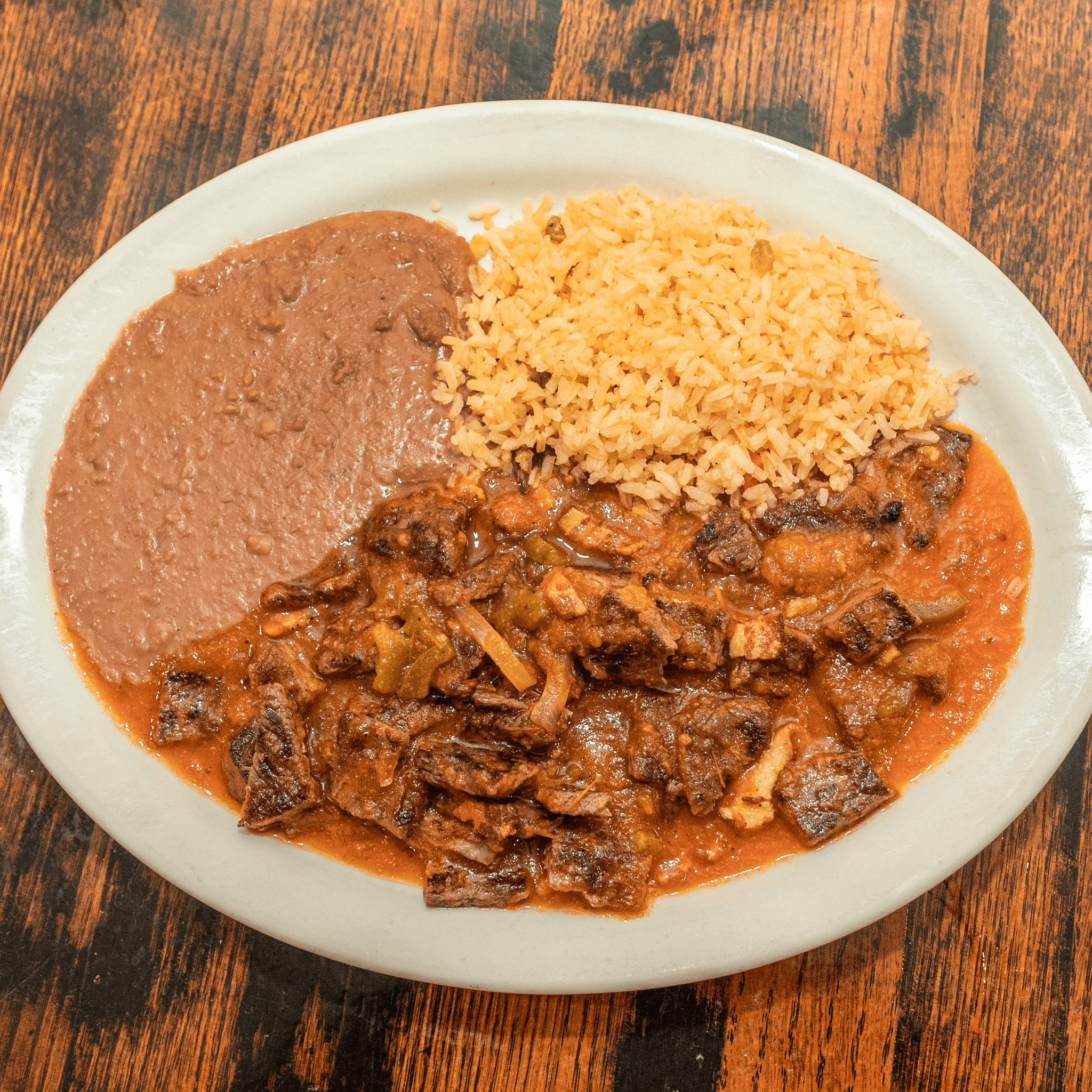 Chopped beef fajitas topped with our delicious ranchero salsa served with refried beans, rice, and tortillas