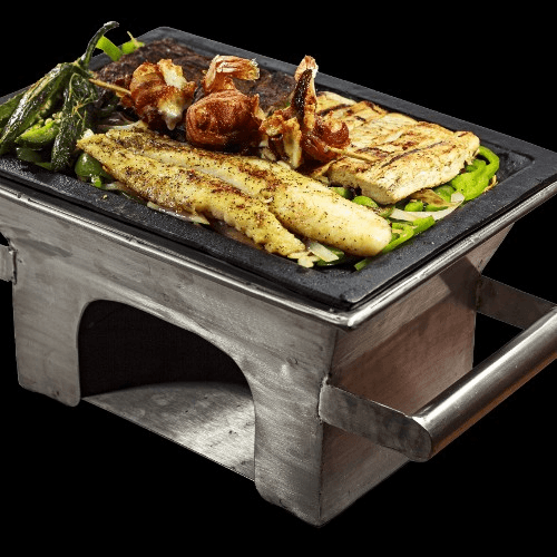 Beef fajitas, chicken fajitas, (1) grilled fish filet and (3) shrimps with jalapeño and cheese wrapped with bacon. served with charro beans, rice, guacamole pico de gallo, chile toreado and tortillas.