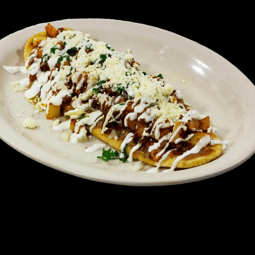 Homemade corn tortilla served with sauted chicken, beans, green sauce, onions, cilantro, sour cream and fresco cheese.