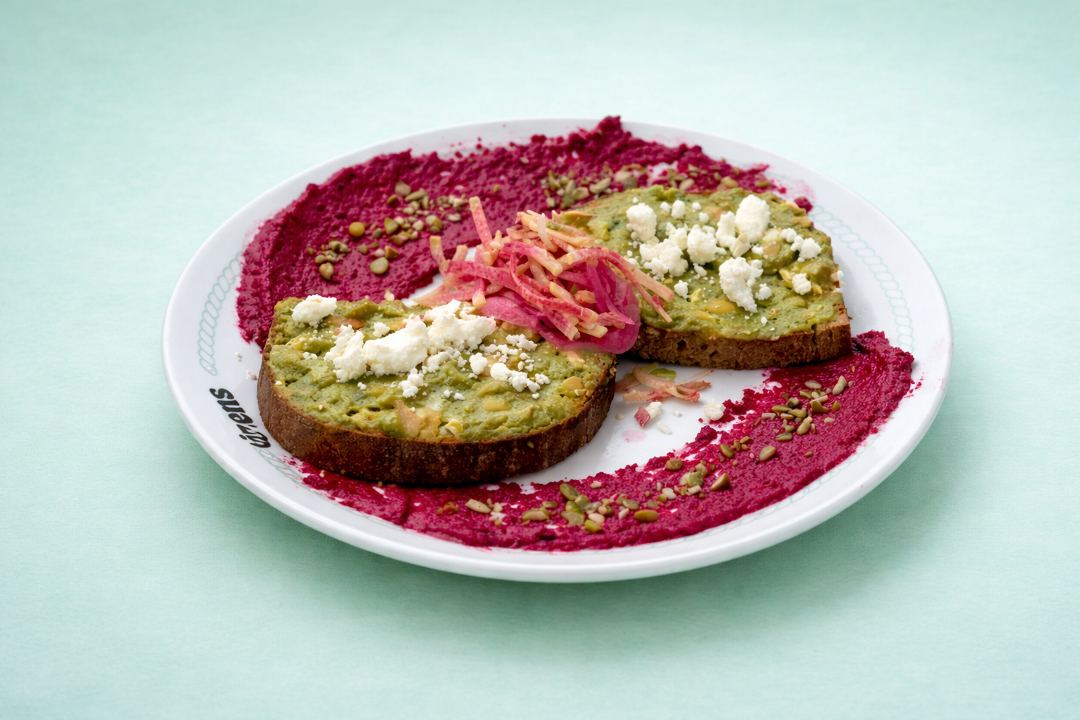 Avocado tossed with feta, lime, cilantro on top of thick-cut multigrain toast. Garnished with pickled onion, radish, pumpkin seeds and beetroot hummus