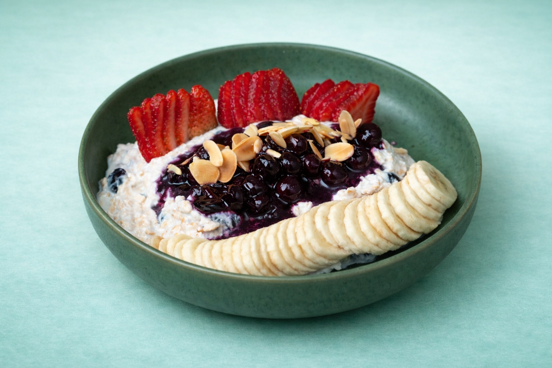 Overnight coconut milk soaked oats, blueberries and agave topped with blueberry compote, seasonal fruit and toasted almonds