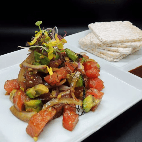 6 oz. Wild catch. Ahi tuna, limu seaweed, sweet onions & wasabi shoyu. On thin rice crisps
