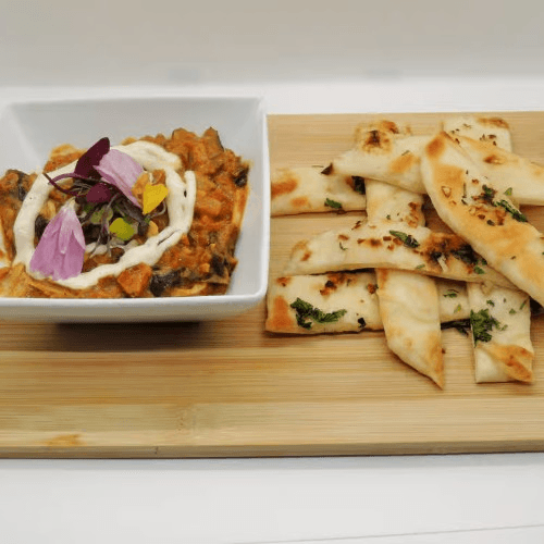 Vegetarian. Spicy. Local. Gluten. Masala spiced spinach-tomato curry with paneer cheese & naan bread to dip.