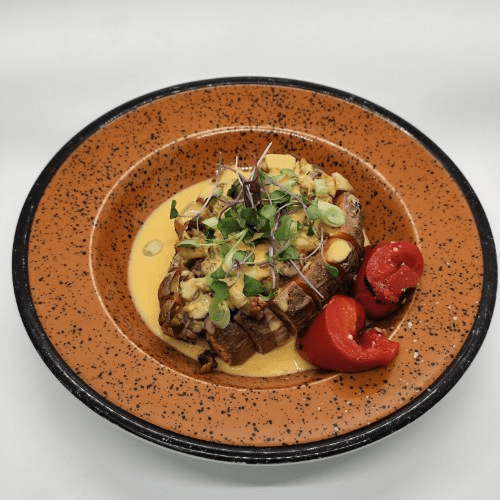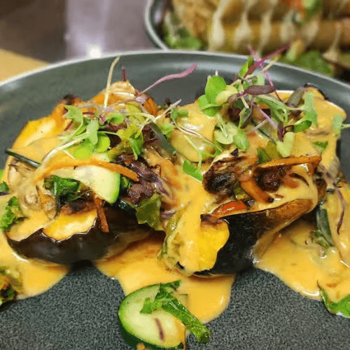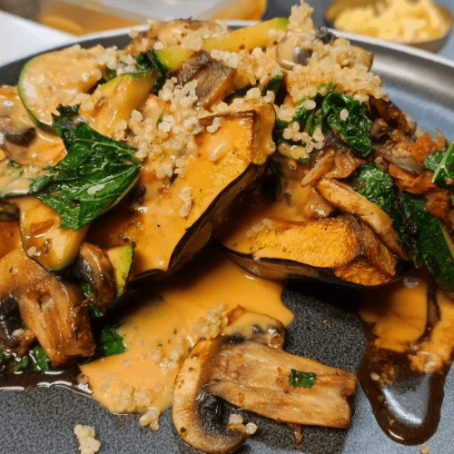 Vegan. Roasted acorn squash topped with grilled mushrooms, zucchini, kale, oat-cheese sauce & crispy quinoa.