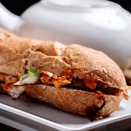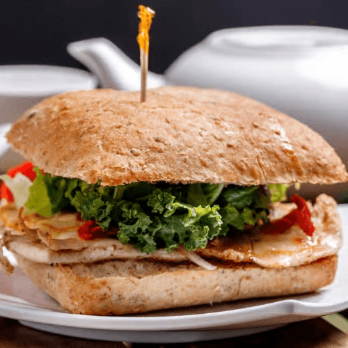Halal. Free-range local chicken, sun-dried tomatoes, grilled onions, Cheddar, greens & basil vinaigrette on a ciabatta roll