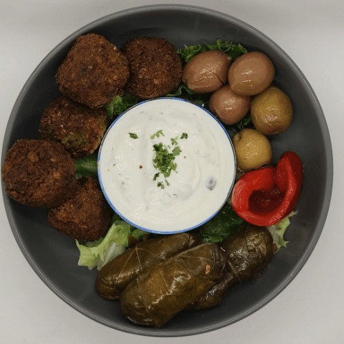 Falafel fritters, stuffed dolmas, & olives. Choose between Tzatziki (vegetarian) or Hummus (vegan) for dipping.