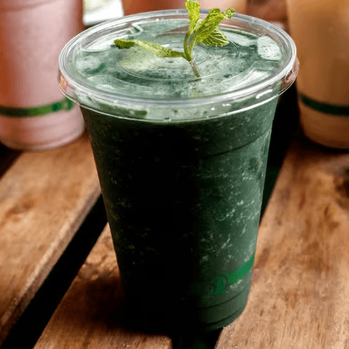 Protein rich. Kale, almonds, spirulina, mint, chia, orange & raw cacao