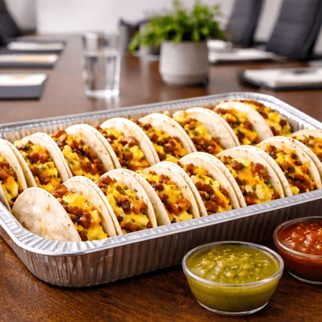 A dozen fresh breakfast tacos with your choice of fillings like cheese, bacon, zucchini, chorizo, and more. Perfect for sharing.