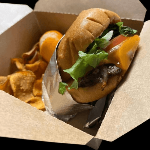Prime rib or veggie (seaweed/pea protein) patty, Cheddar, tomato, greens & our signature pickle aïoli. On a brioche bun.