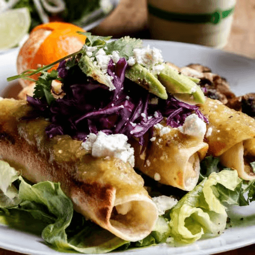 Vegan. Mild. Crispy rolled flautas filled with seasoned potatoes, topped with mild tomatillo sauce, eggless garlic aioli, a fresh shredded cabbage–carrot mix, and chopped avocado. Served with your choice of steamed broccoli or savory sautéed mushrooms on the side. Comfort food, Nokturne style.