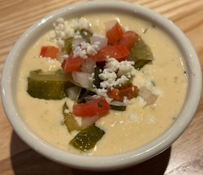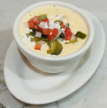 Our creamy house queso blended with tender poblano rajas for a rich, savory Tex-Mex finish.