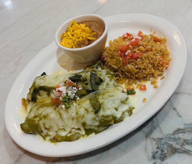 Two corn tortillas filled with our house veggie mix of squash, zucchini, and red onions. Topped with enchilada cheese, creamy poblano sauce, and classic rajas. Served with Mexican rice and refried beans.