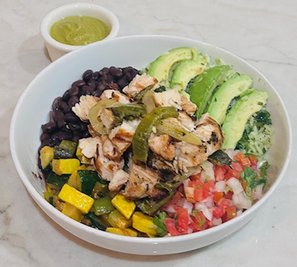 Cilantro rice and black beans topped with fajita-marinated chicken, seasoned veggies, rajas, fresh pico and avocado slices. Finished with poblano crema.
