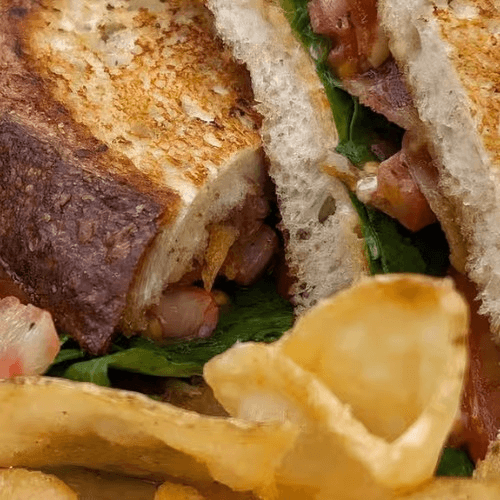 Toasted sourdough, bibb lettuce, peppered tomato, candied bacon, garlic lemon aioli. Extra charge for a club: grilled chicken, cheddar.