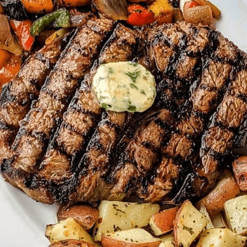 14 oz. Certified Angus beef, garlic herb mashed potatoes, asparagus. Choice of: house or Caesar salad. Consuming raw or undercooked meats, poultry, seafood, shellfish, or eggs may increase your risk of foodborne illness.