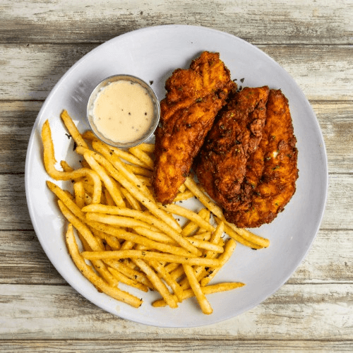 Light & crispy waffles, topped with fried chicken tenders, side of hot honey butter.