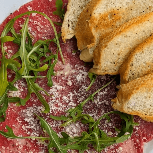 Beef tenderloin, lemon juice, parmesan, truffle oil, micro arugula, crostinis. Consuming raw or undercooked meats, poultry, seafood, shellfish, or eggs may increase your risk of foodborne illness.