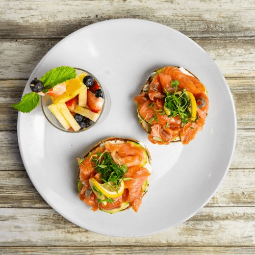 Philadelphia cream cheese on a toasted bagel, topped with Applewood smoked salmon, thinly sliced cucumbers, dill sprig, garnished with a lemon, fresh fruit.