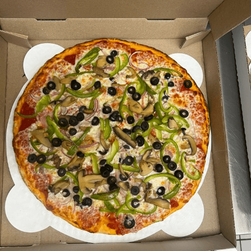 Bell pepper, red onion, black olive, and mushroom