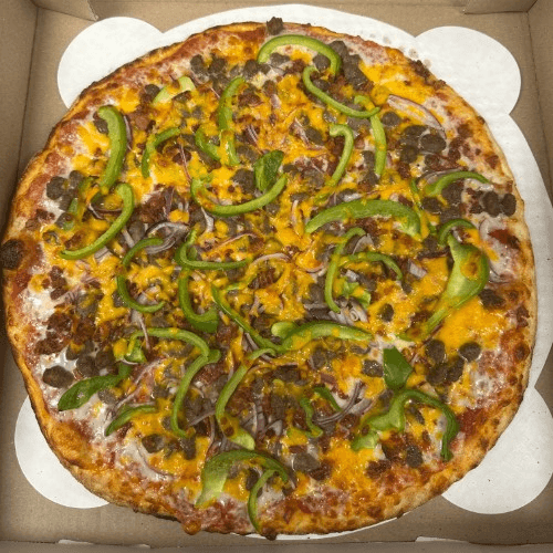 Pepperoni, Italian sausage, Hamburger, black olive, Canadian Bacon, red onion, bell pepper, and mushroom