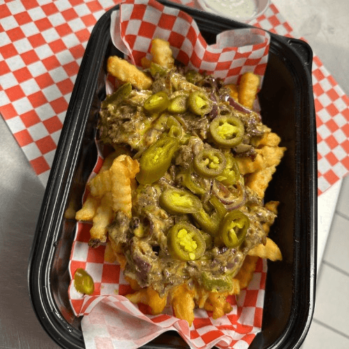 Large order of seasoned fries topped with Philly steak, cheese sauce, sautéed red onions and bell peppers