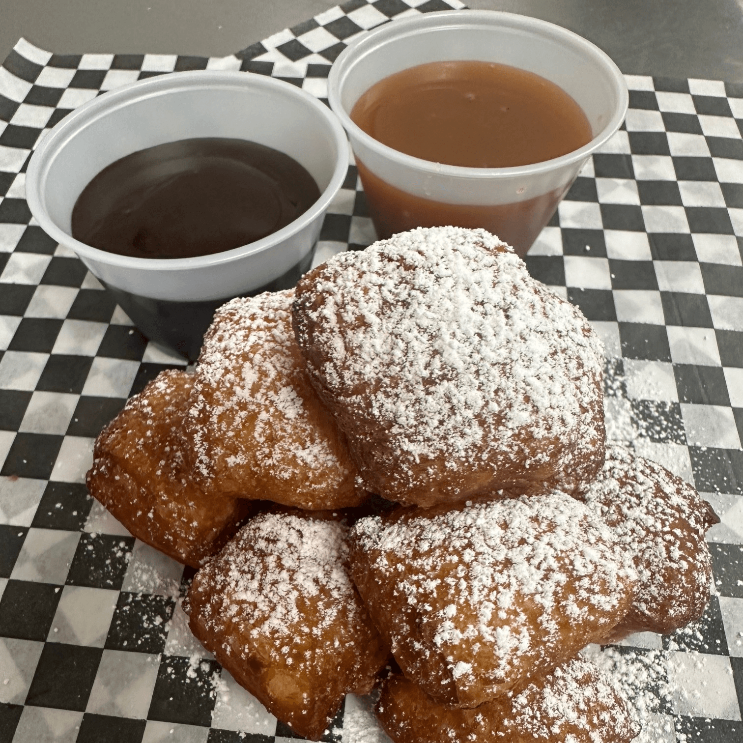 Our Beignet Bites are made to order and fried until golden brown. Dusted with powdered sugar and served with chocolate and/or caramel sauce