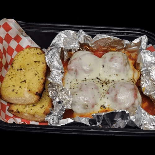 4 meatballs served in sauce, topped with mozzarella and includes a side of garlic bread