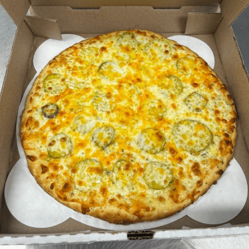 Garlic ranch base, mozzarella cheese, pickles, and cheddar