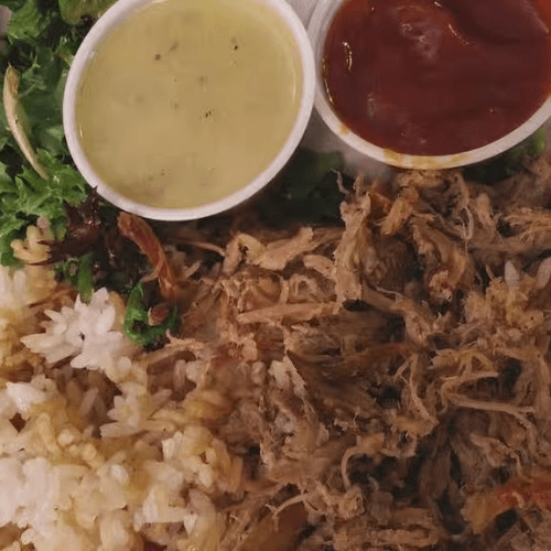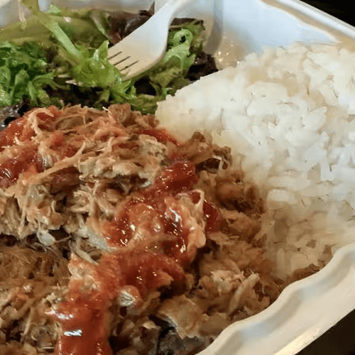 12-Hour slow-roasted kalua pulled pork+cabbage mix, white rice, side of guava BBQ sauce