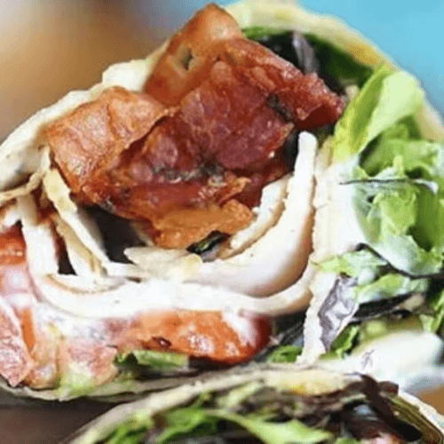 Salad greens, cheese, tomato, turkey, bacon, and ranch in a flour tortilla
