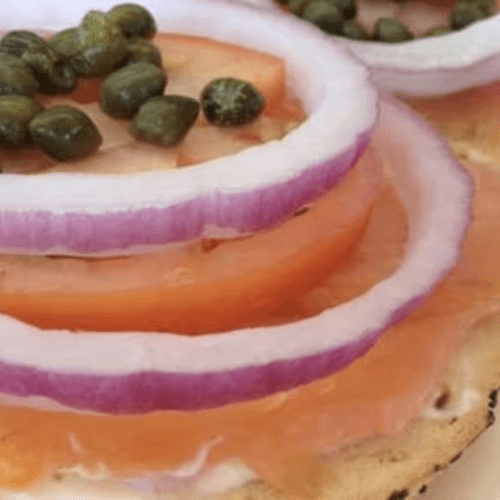 Cream cheese, smoked salmon, red onions, tomato, & capers