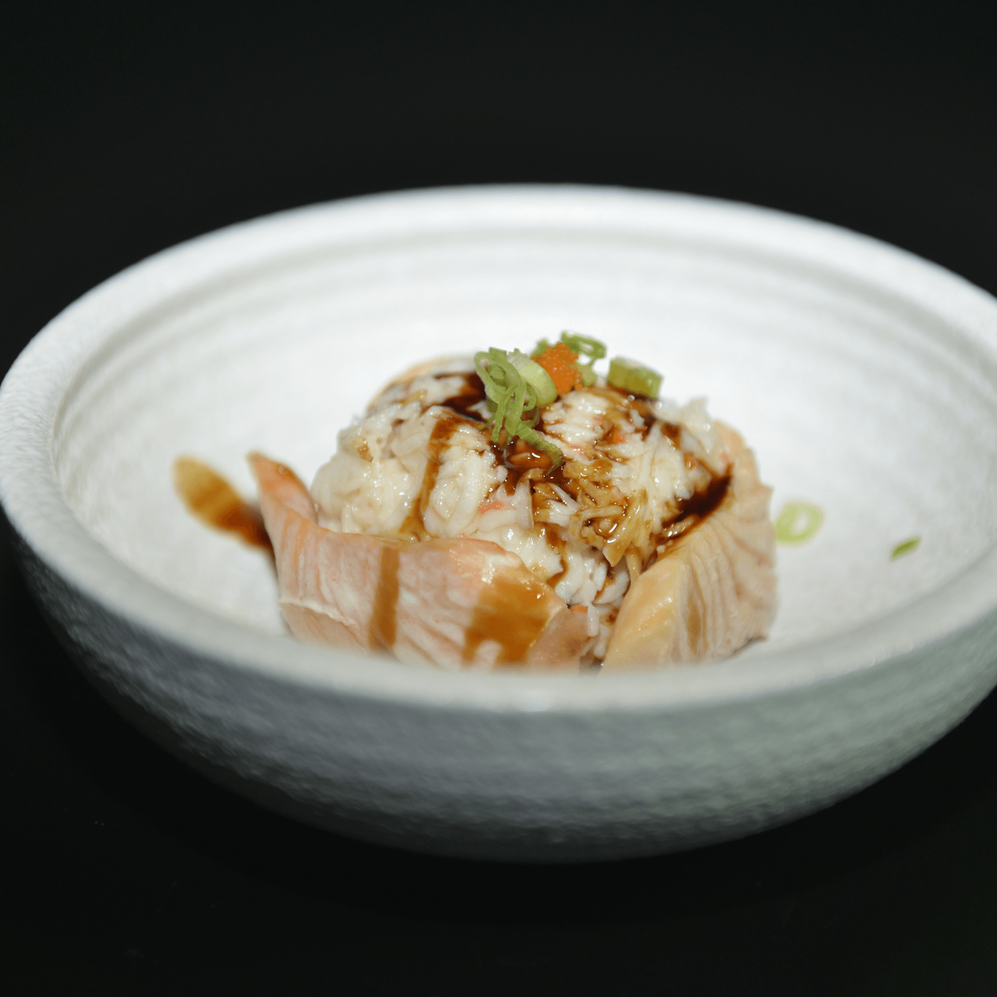 Tender baked salmon, brushed with savory Japanese seasonings and baked until perfectly flaky, served with snow crab and mayo.