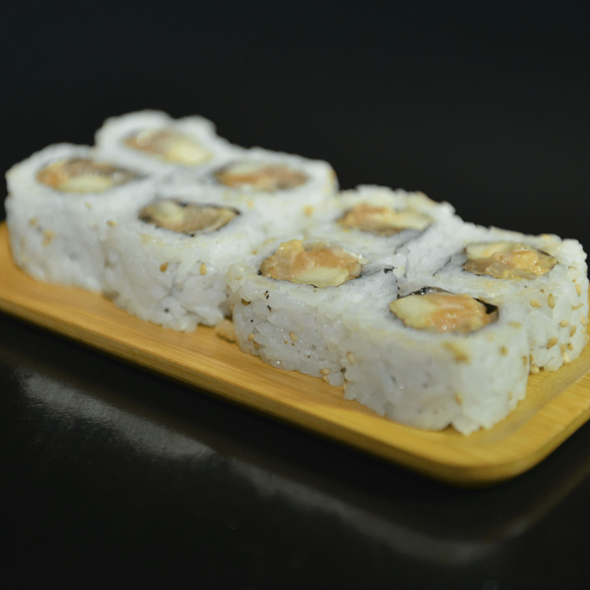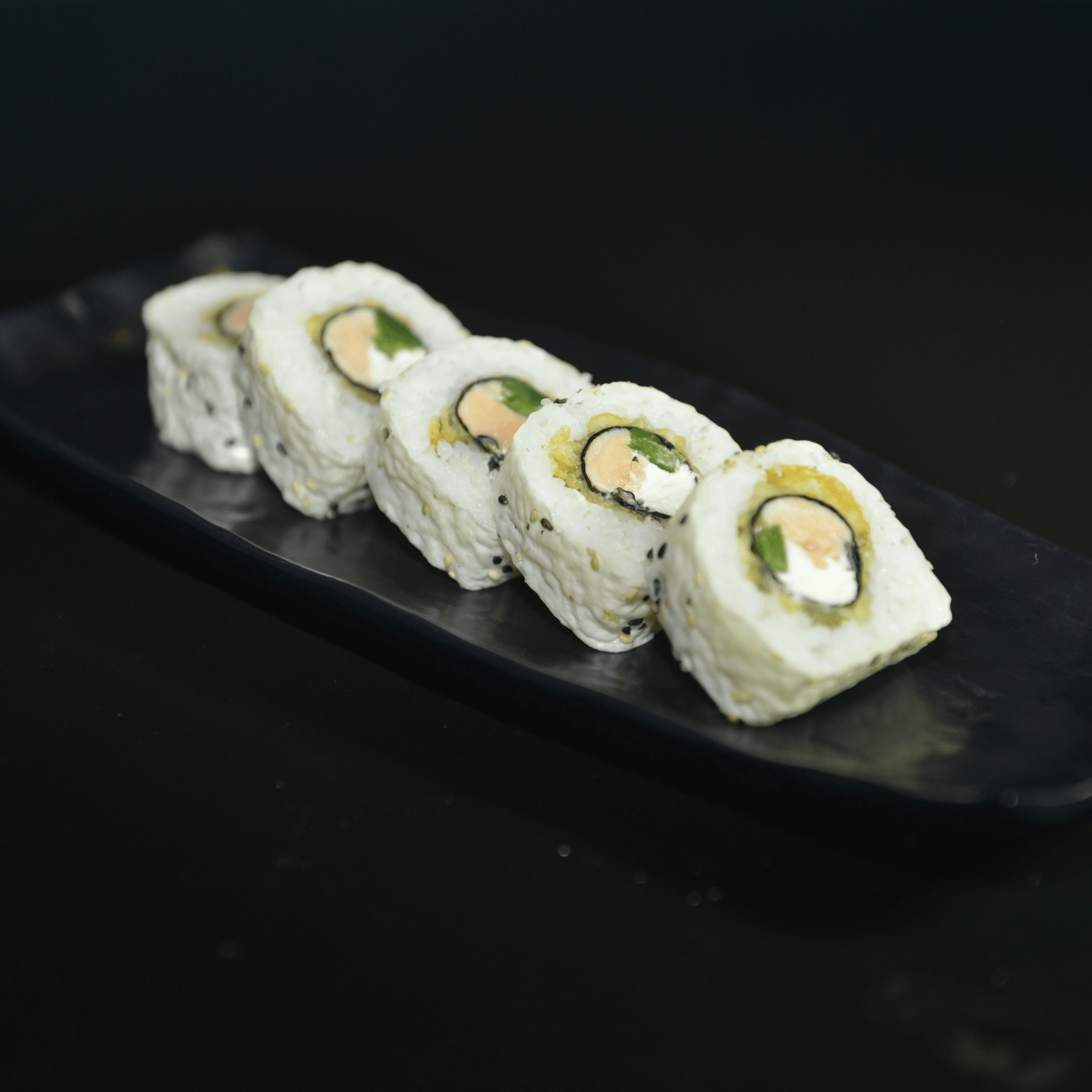 Smoked salmon, cream cheese, and jalapeño rolled with sushi rice and seaweed, lightly baked for a bold and smoky flavor.