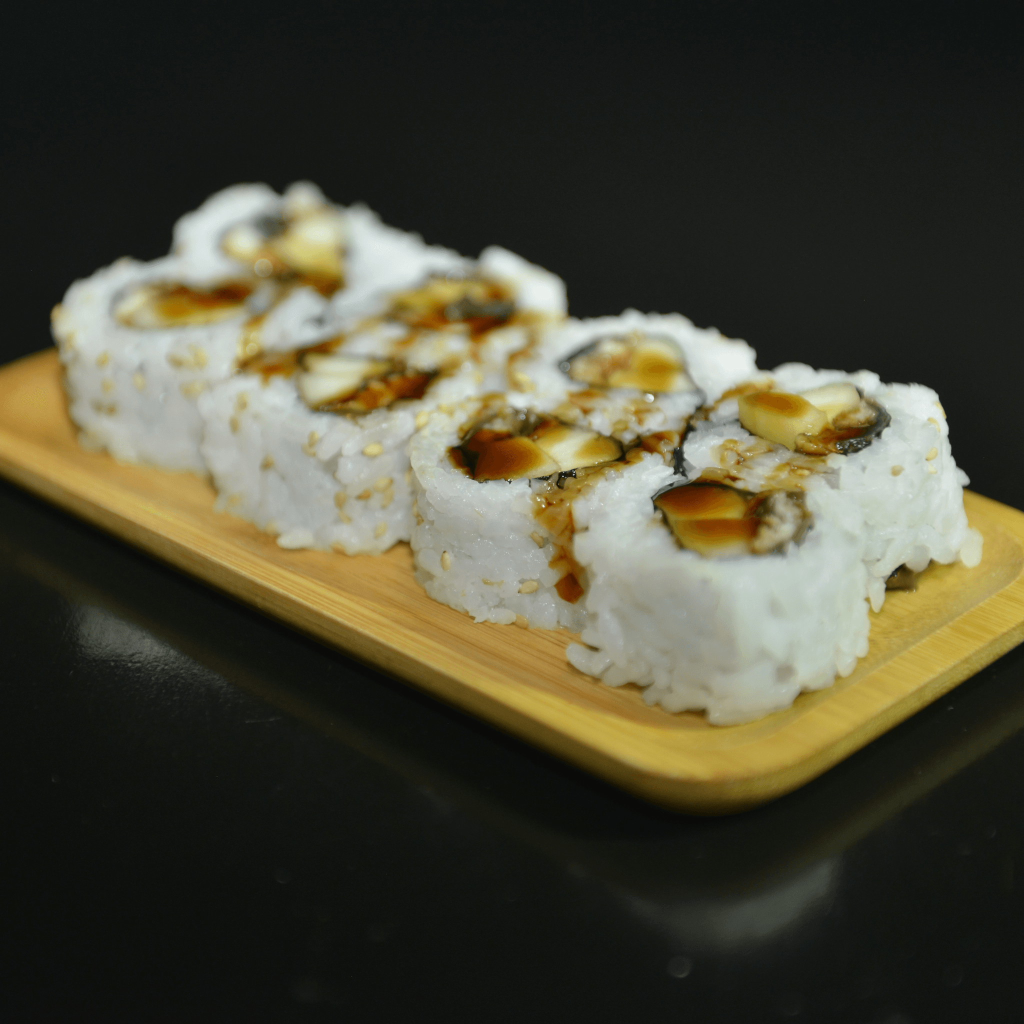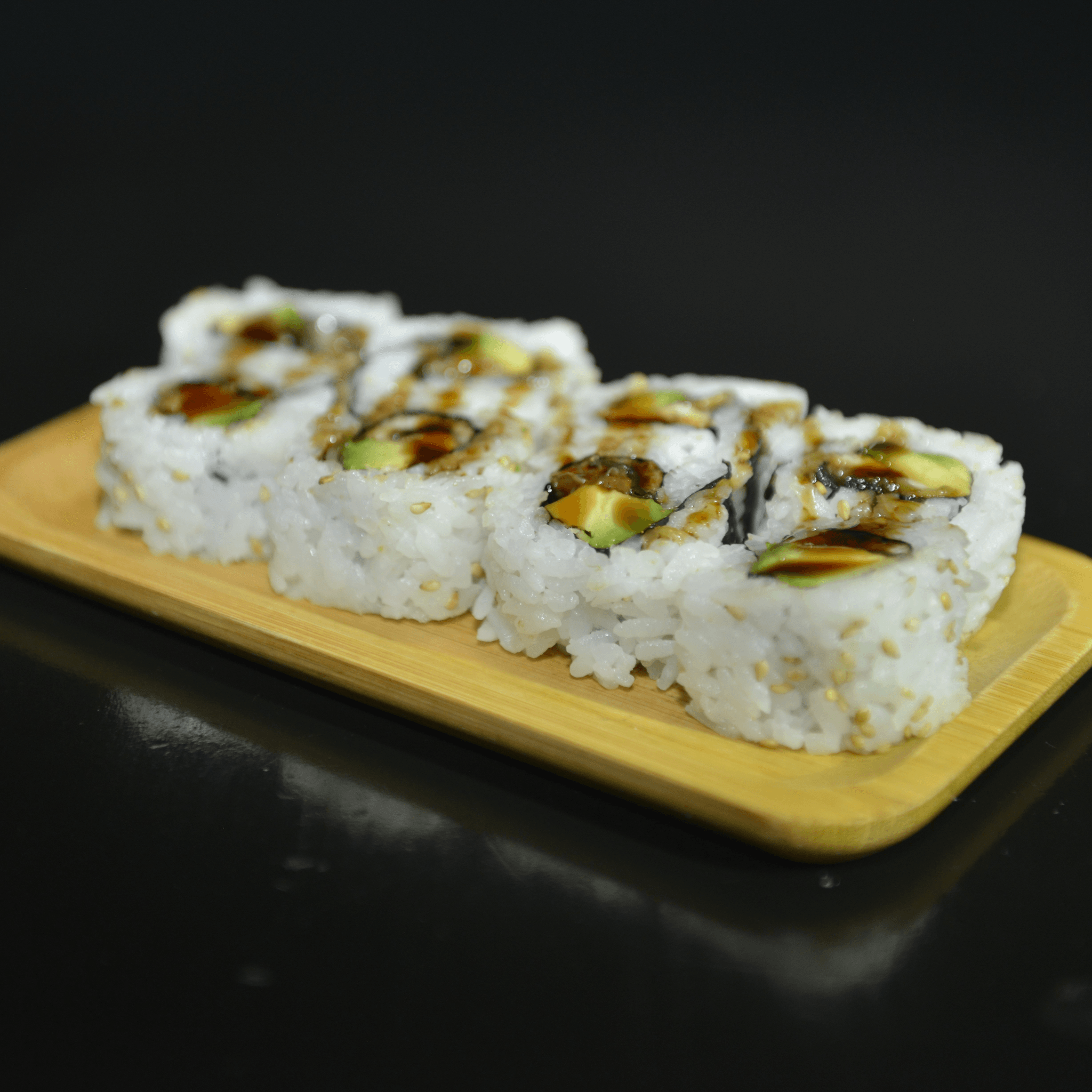 Inside eel, cucumber. Topped with avocado. Served with eel sauce.