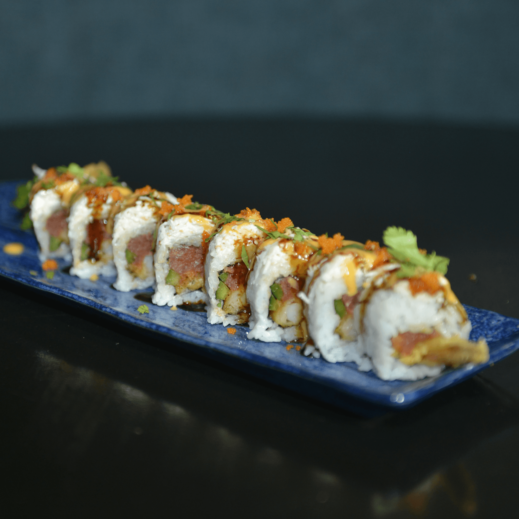 Shrimp tempura, spicy tuna, jalapeño. Top with spicy crab, cilantro, smelt roe. Served with spicy mayo, eel sauce.