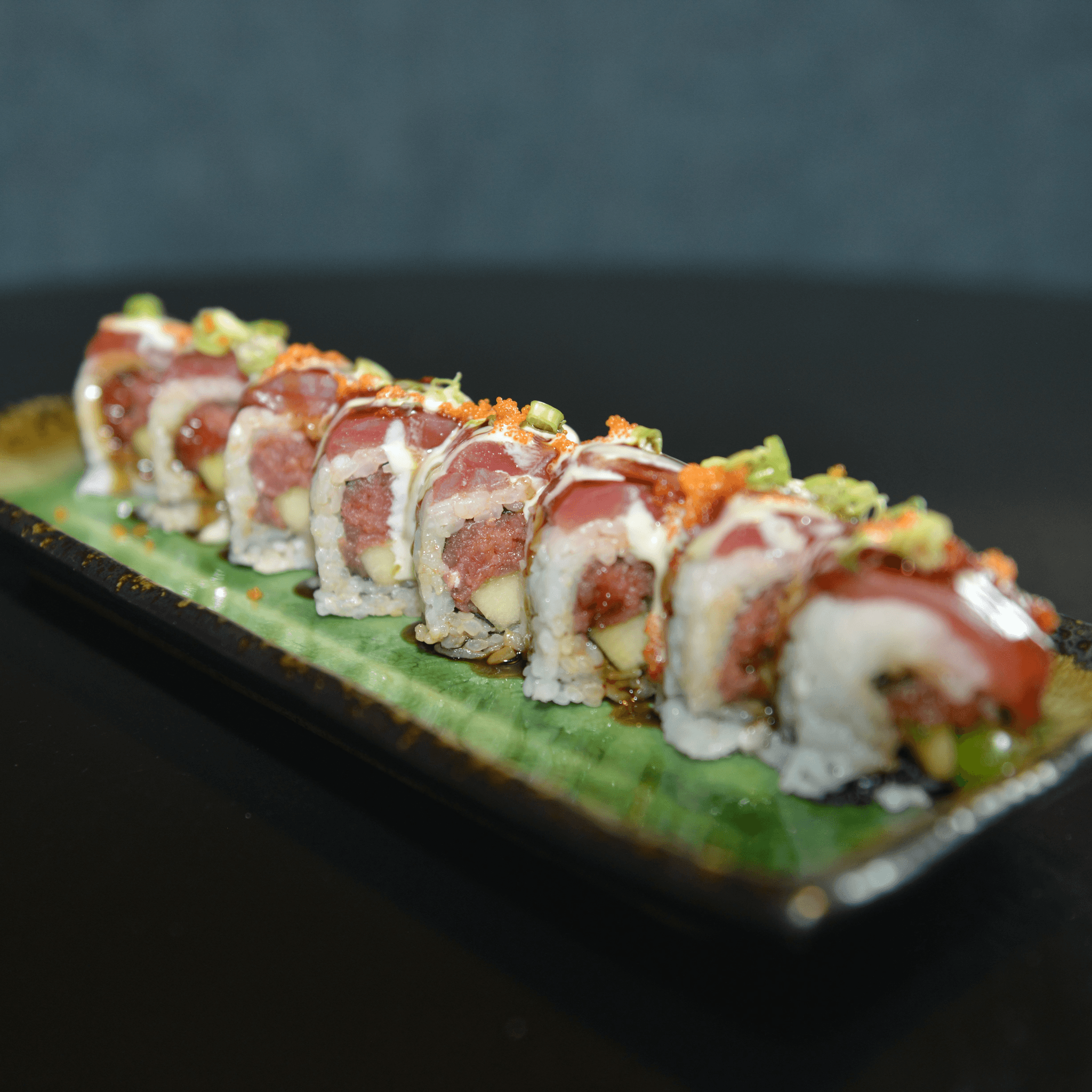 Spicy tuna, cucumber, jalapeño inside, top with fresh tuna, green onions, smelt roe. Served with ponzu garlic, eel sauce, honey wasabi.