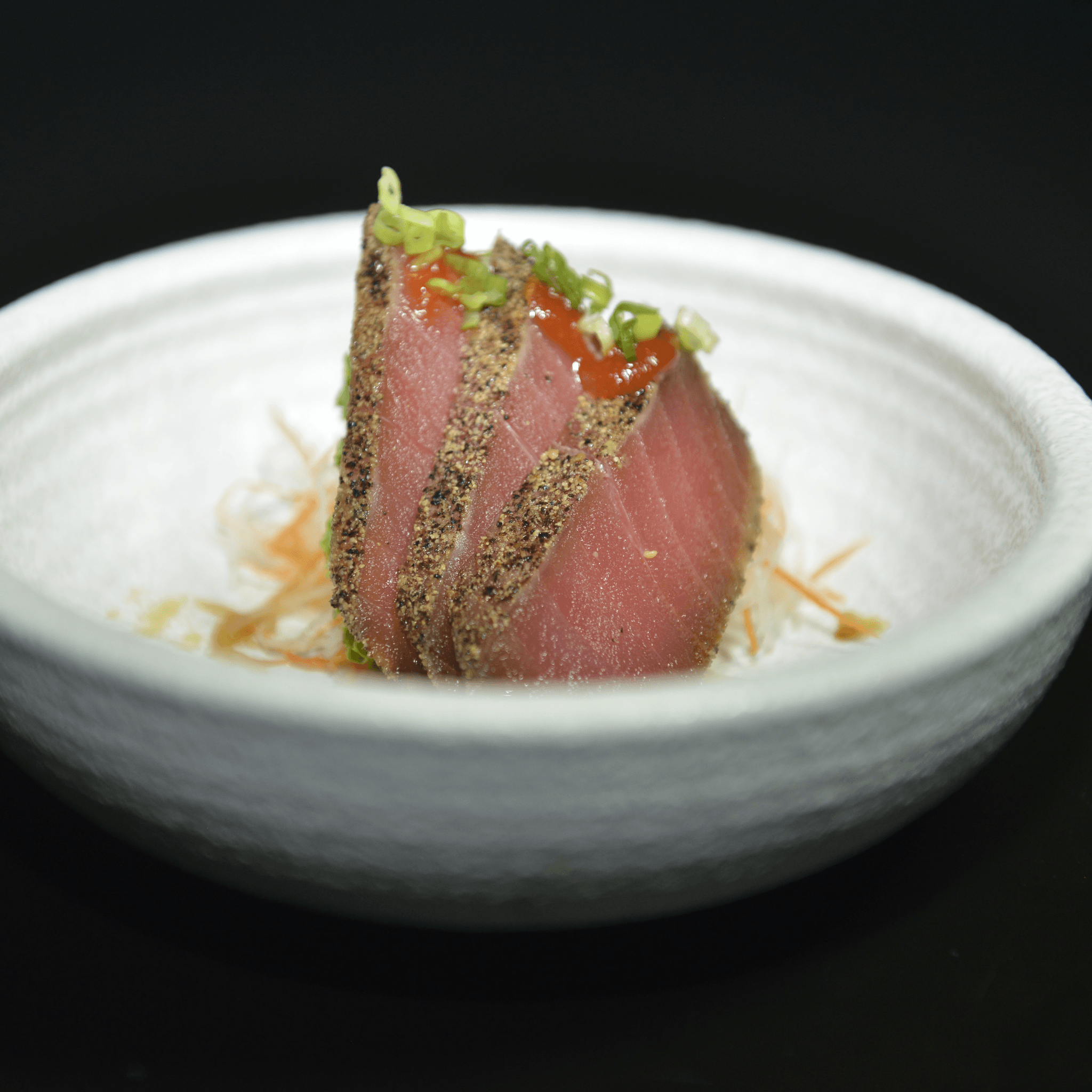 Lightly seared albacore tuna, thinly sliced and served chilled with ponzu sauce, garnished with scallions.