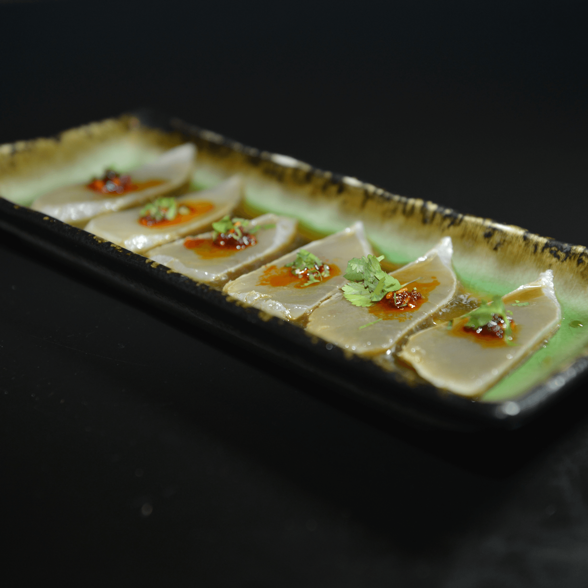 Delicate, paper-thin slices of fresh red snapper, drizzled with yuzu-soy dressing, finished with microgreens and thinly sliced scallions for a clean umami-rich flavor.