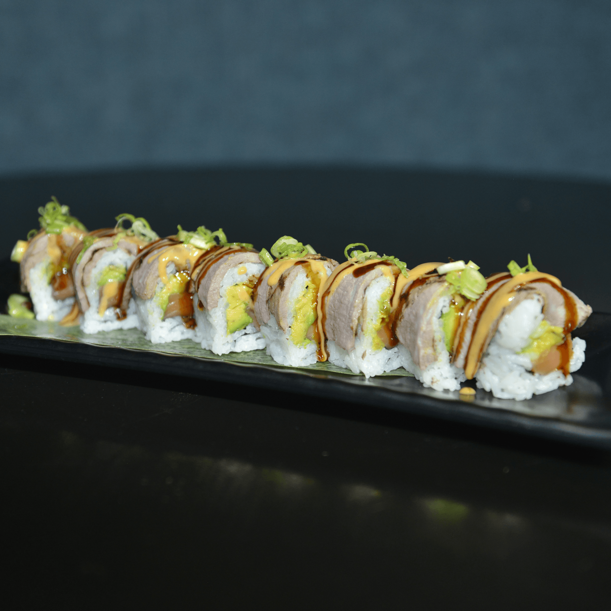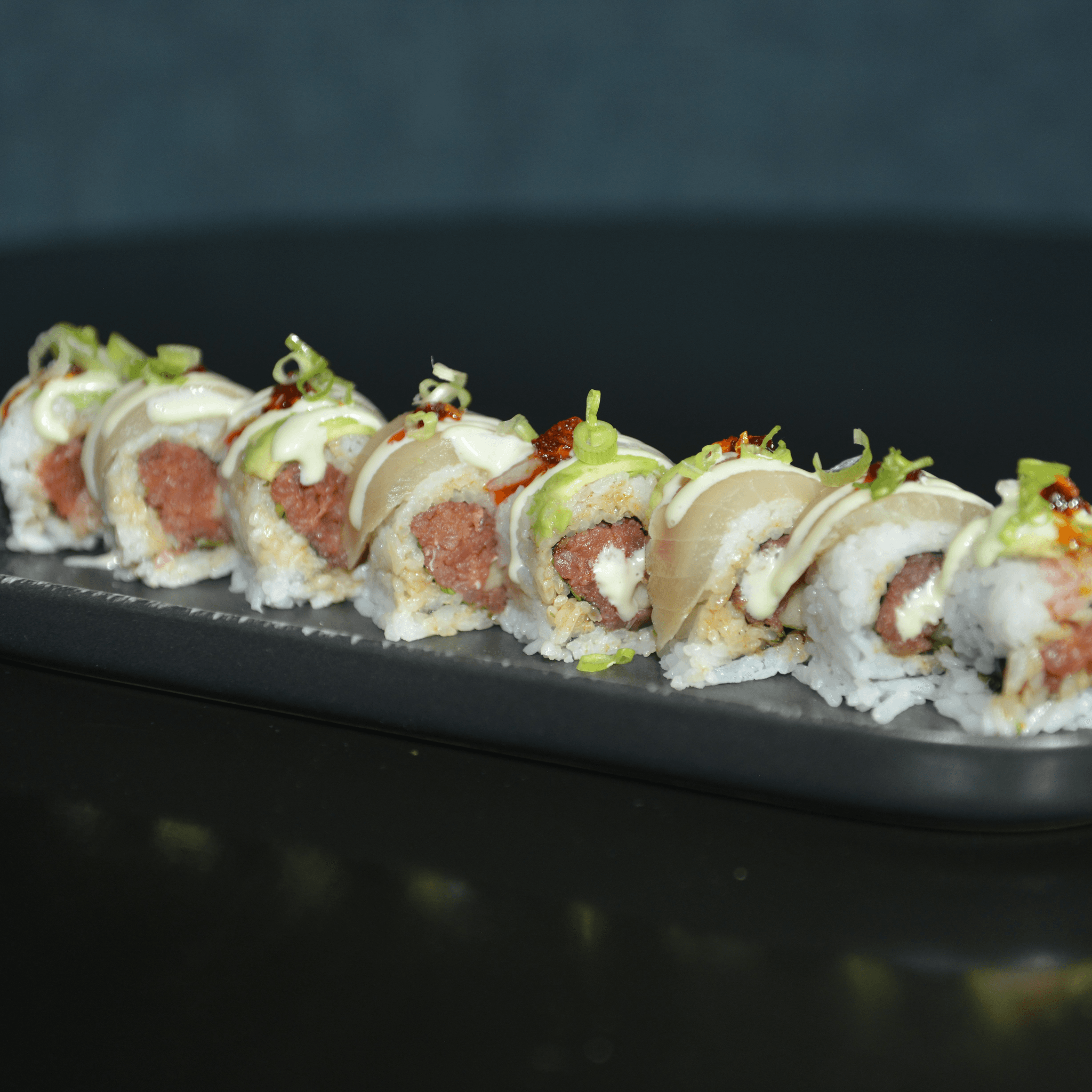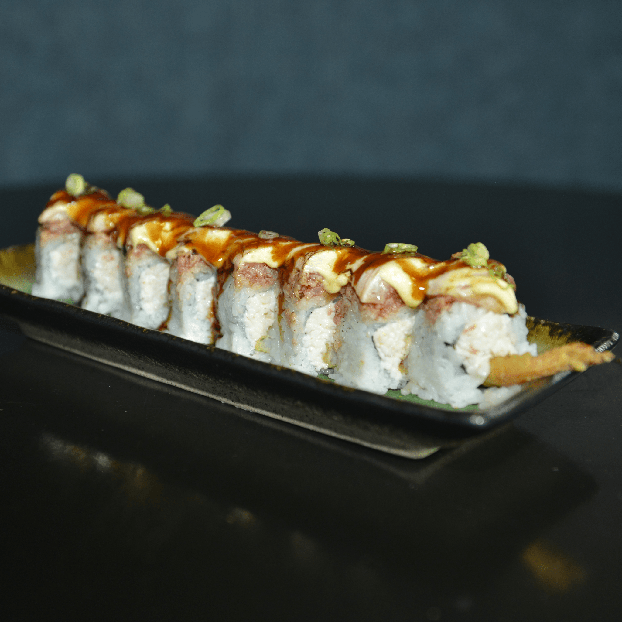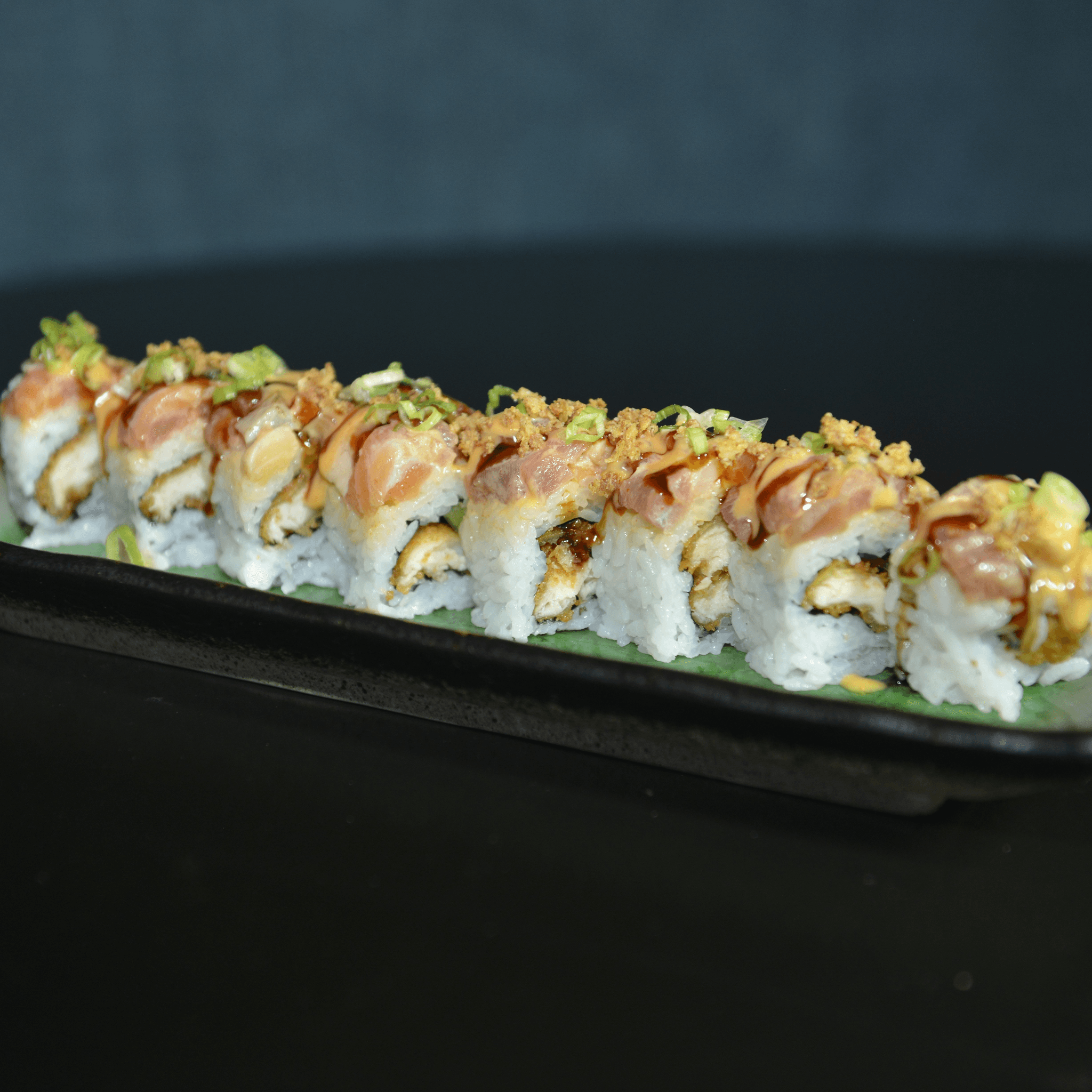 Smoked salmon, avocado. Topped with beef, green onions. Served with eel sauce, spicy mayo.