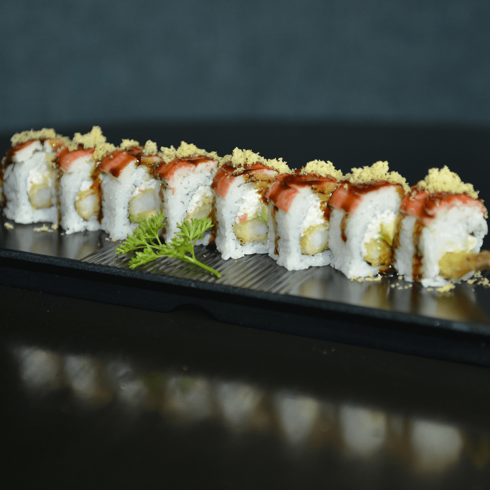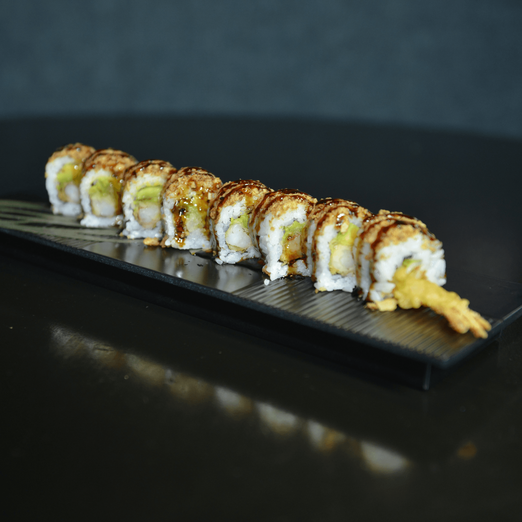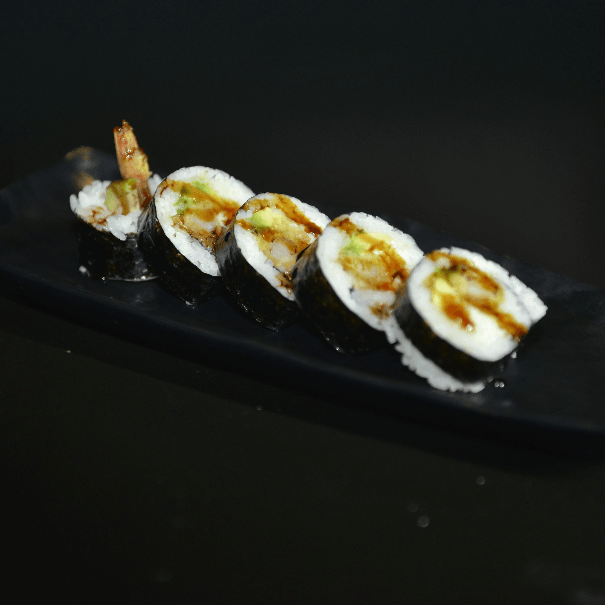 Shrimp tempura, cucumber, and avocado rolled with sushi rice, topped with eel sauce for a sweet and savory finish.