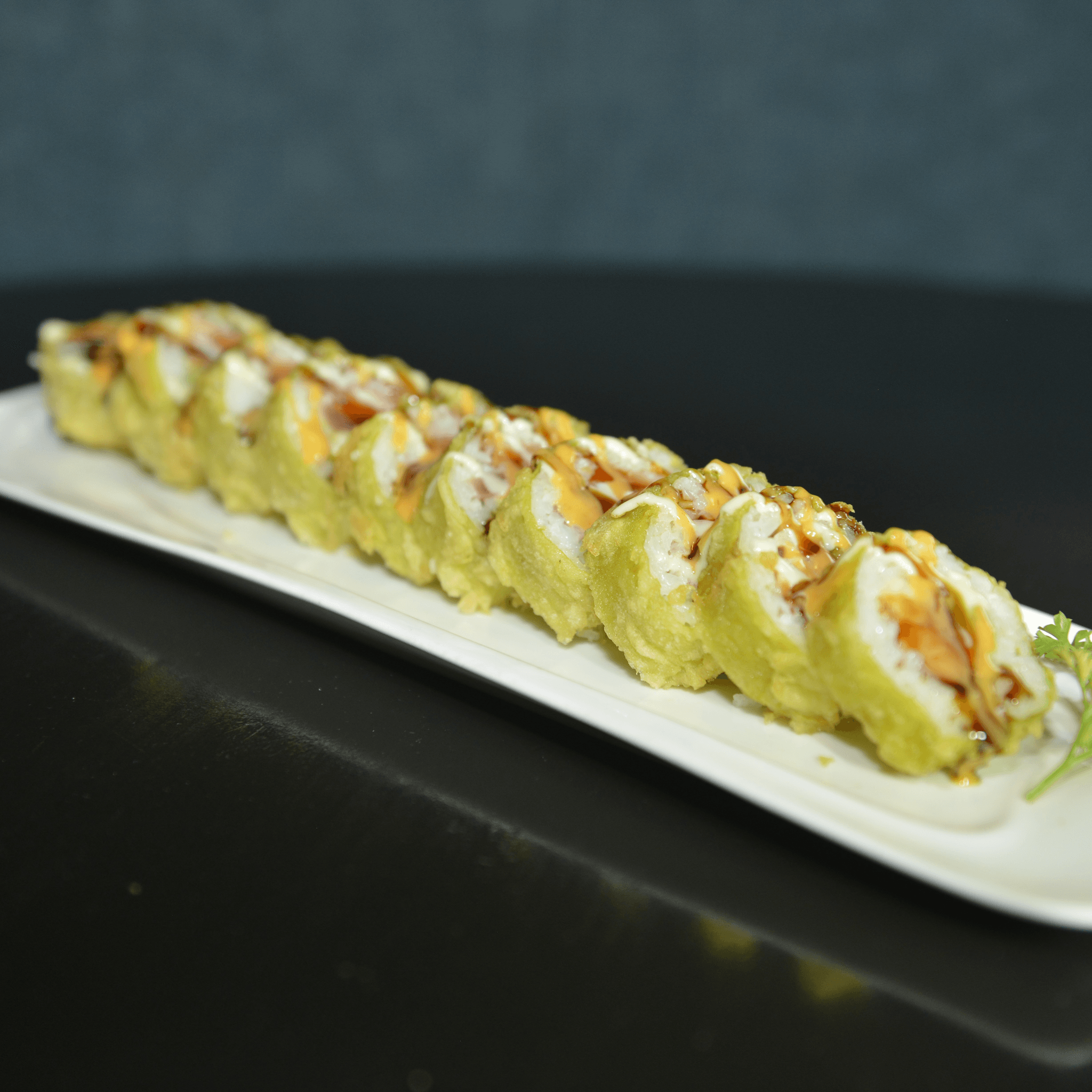 Tuna, salmon, avocado, wrapped in green soy paper. Tempura style, topped with green onions and smelt roe. Served with honey wasabi, spicy mayo, eel sauce.
